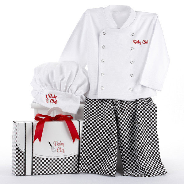 - Three-piece baby chef layette set includes white chef's hat, white chef's coat with secure snap closure and black-and-white checkered pants